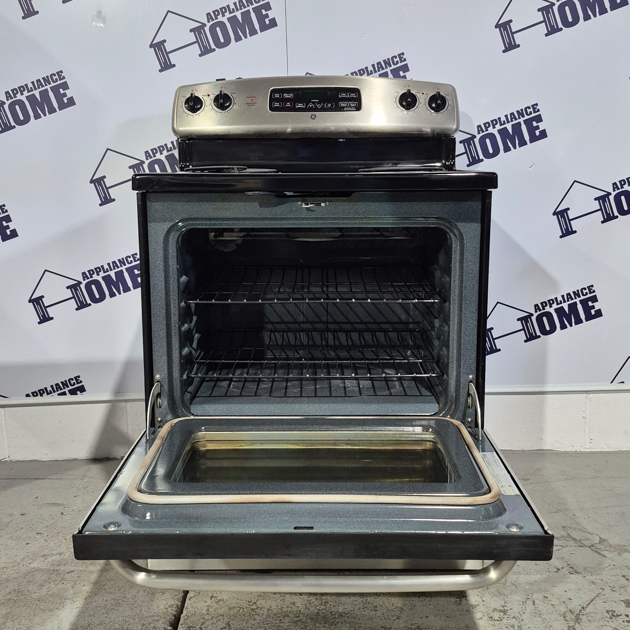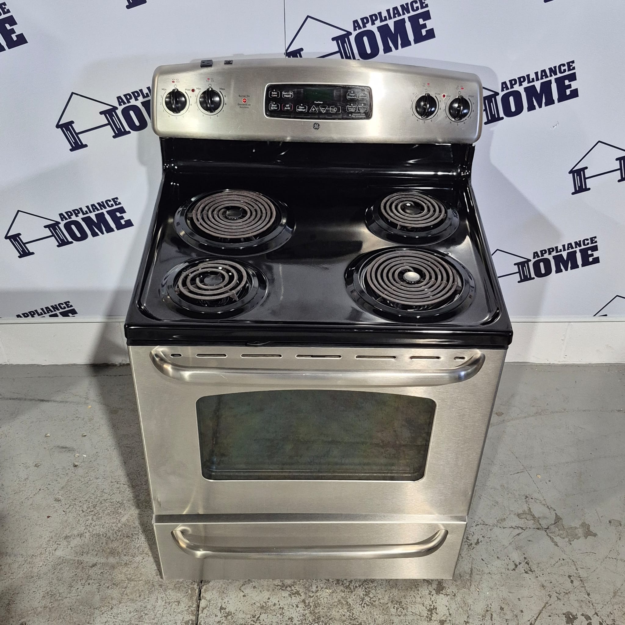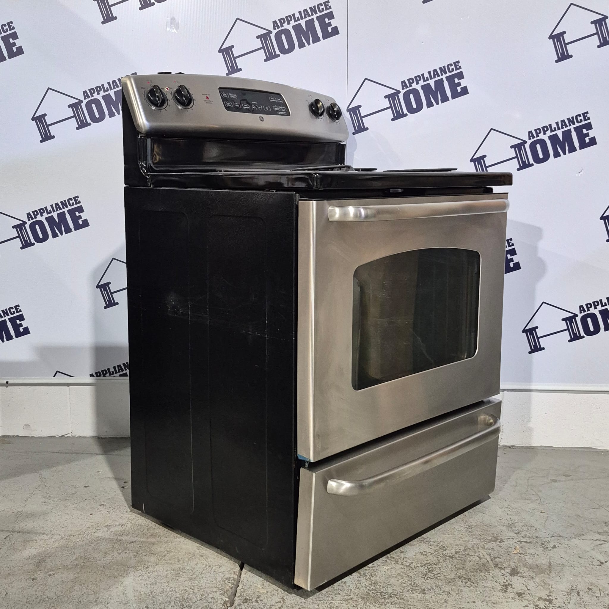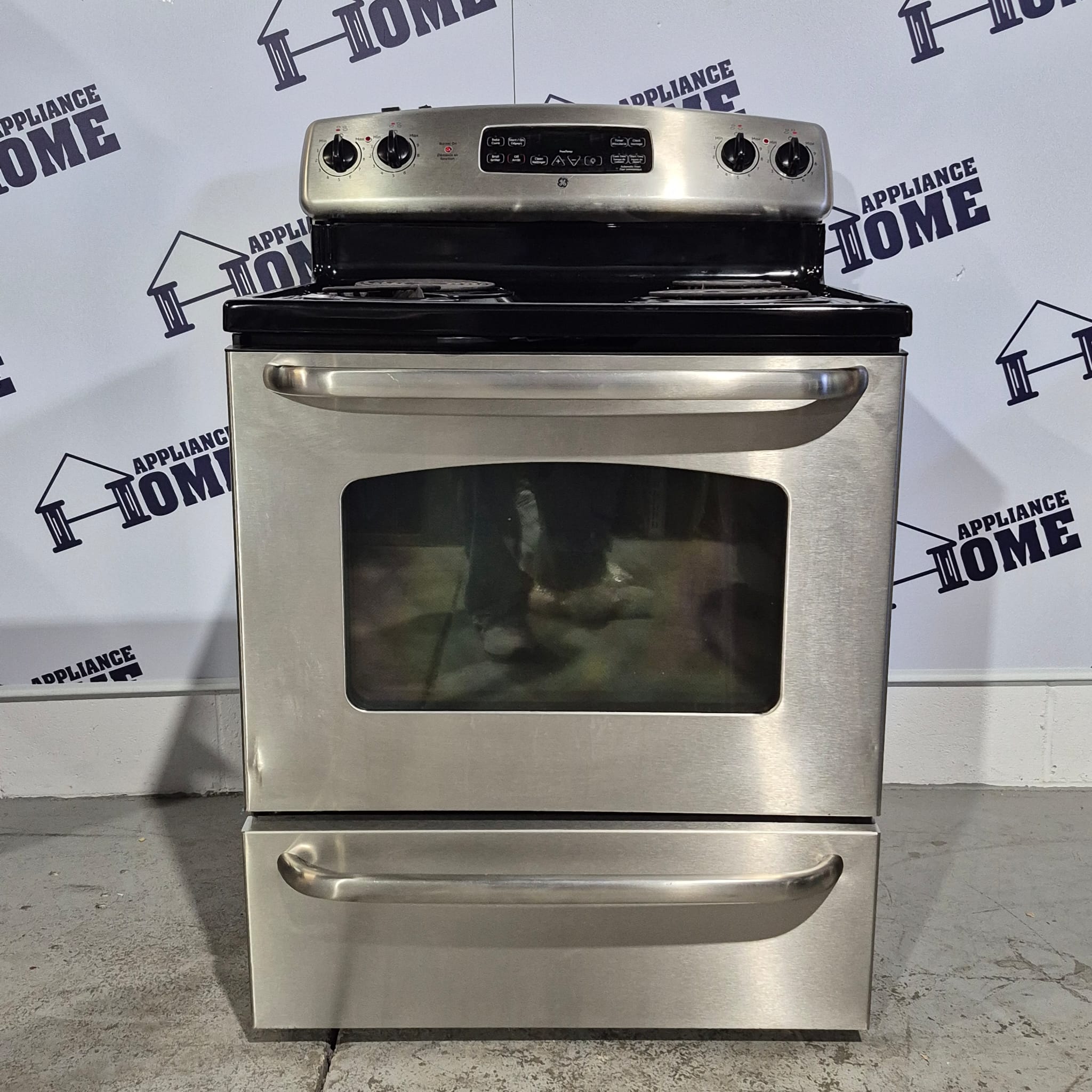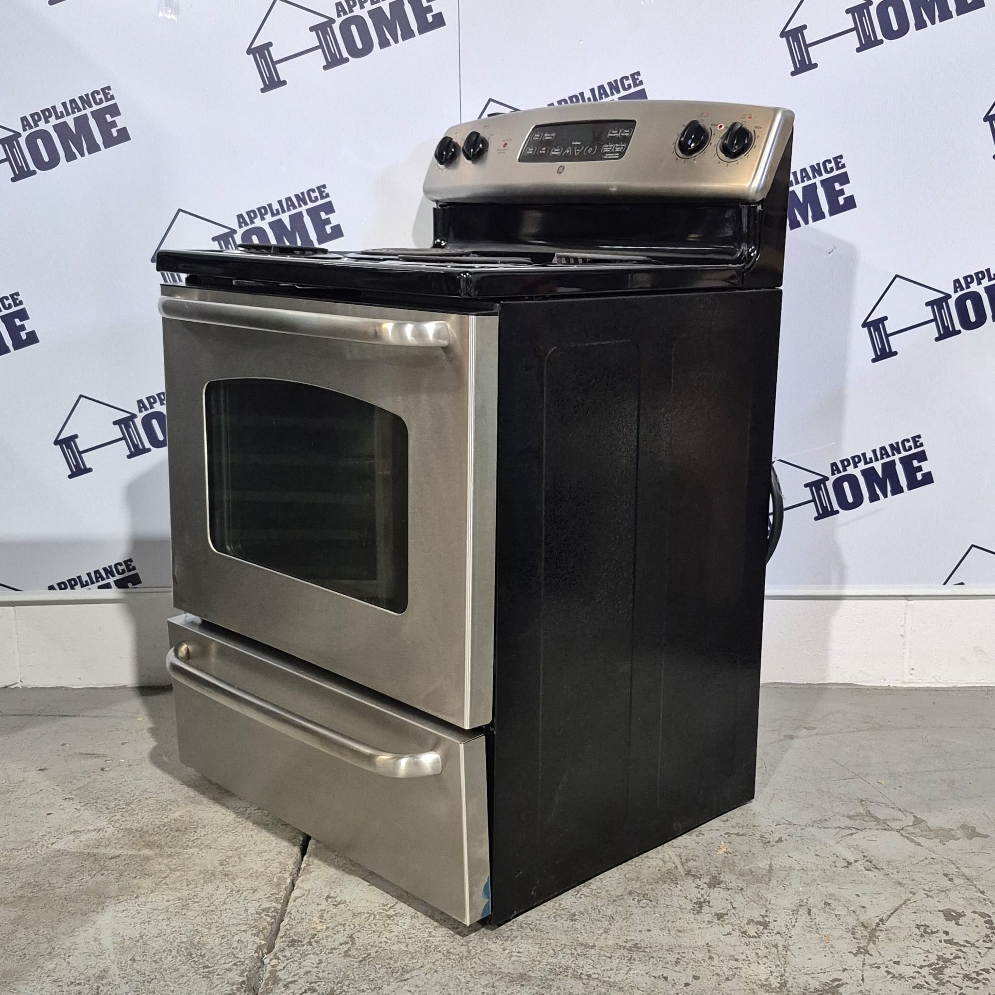 Simplify meal preparation with this reliable and easy-to-clean GE JCBP35SPSS 30-inch Electric Range, professionally refurbished for dependable everyday performance. This freestanding stainless steel appliance offers a practical four-burner cooktop and a full 5.0 cu. ft. self-cleaning oven, providing all the essential functions for family cooking at an outstanding value. The included storage drawer adds convenient space for pots and pans.