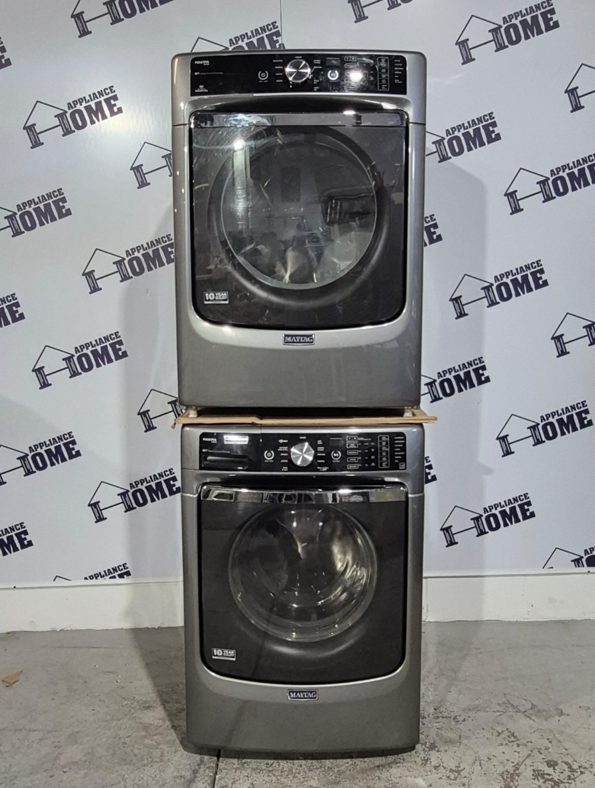 Upgrade your laundry room with this professionally refurbished Maytag front load washer and dryer set. Engineered for quiet, reliable performance and built with Maytag’s commercial-grade durability, this stackable pair (stacking kit sold separately) combines advanced Steam Clean technology in both units with large capacities and a sleek modern grey finish.