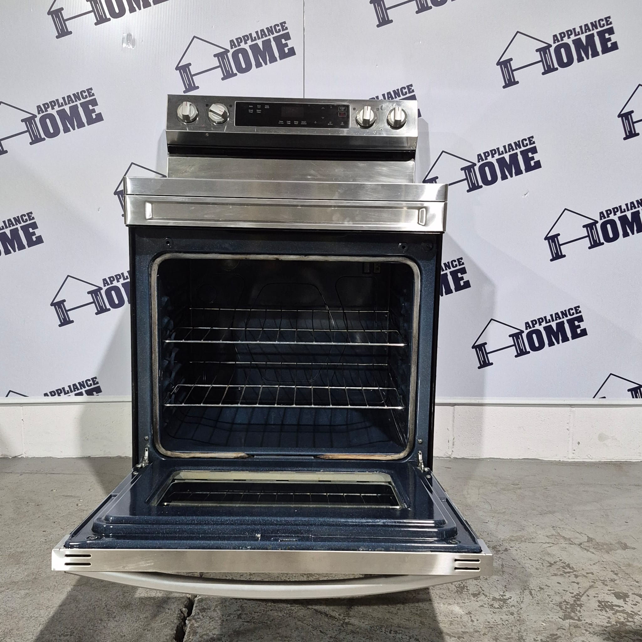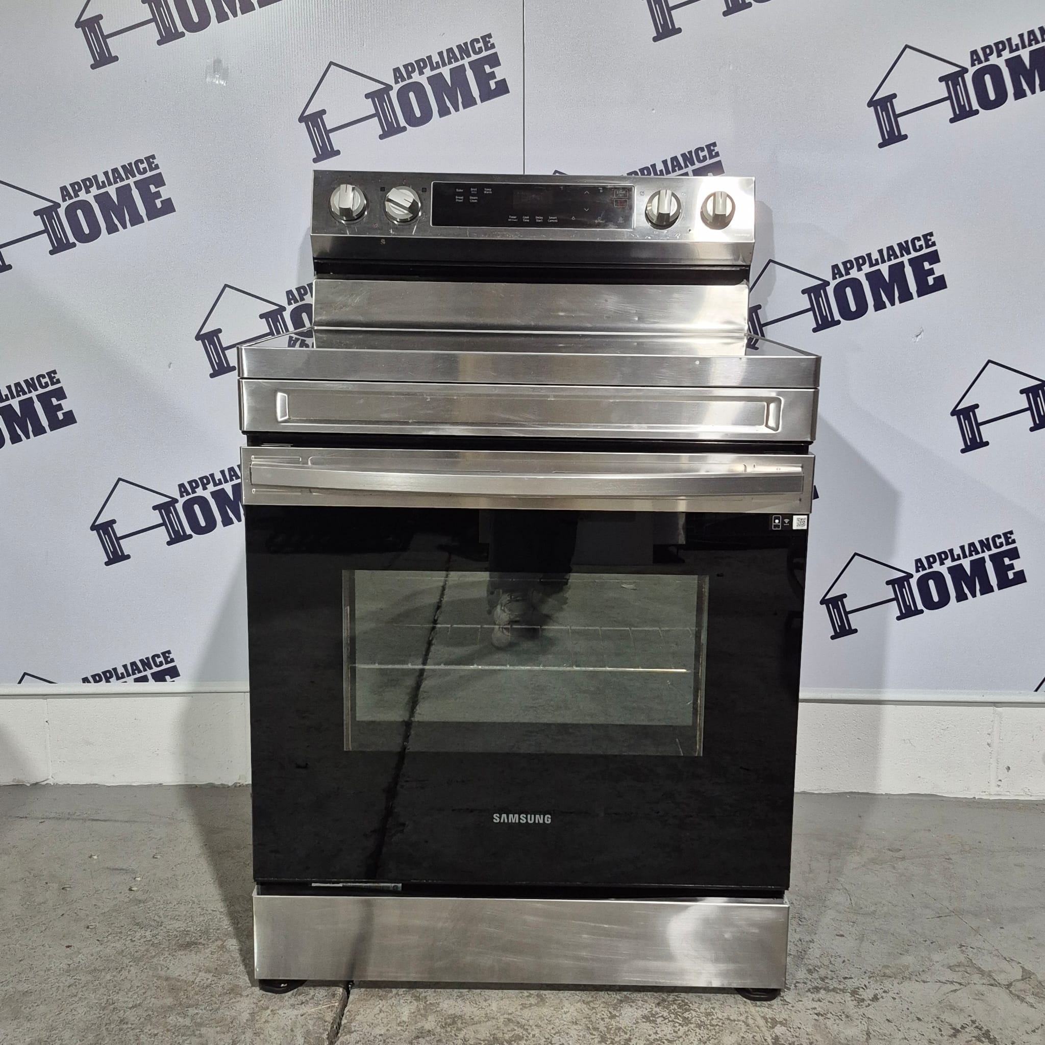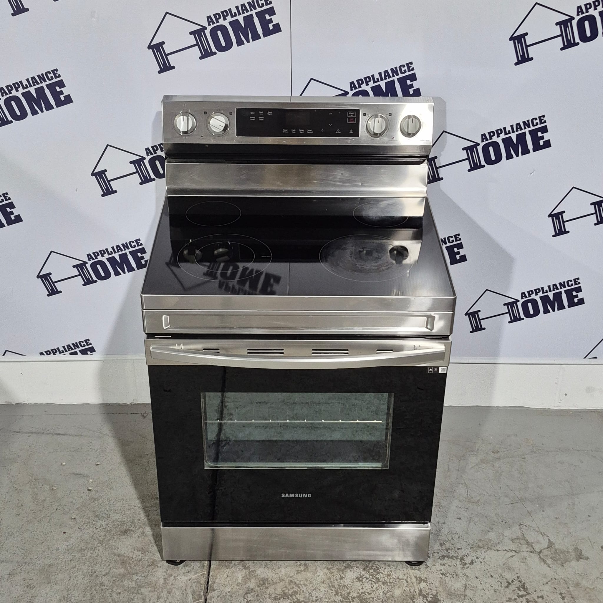 Samsung stove  NE63A6111SS, Electric,  30″ freestanding, Glass top, 4 Burners, 6.3 cu. ft, Storage Drawer, Wifi, smart connection,  Stainless Steel color, Used Refurbished.