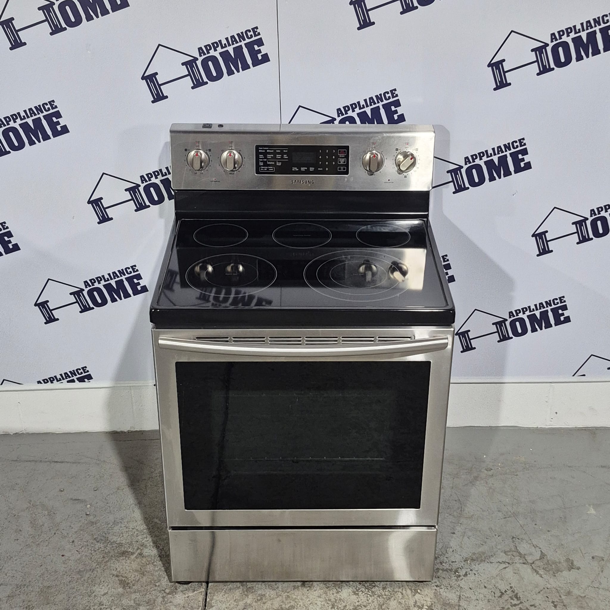Samsung electric stove NE59J7630SS 30″ freestanding, glass top, 5 burner, convection, self clean, steam clean, 5.9 cu ft, Storage Drawer, Stainless Steel color, Used