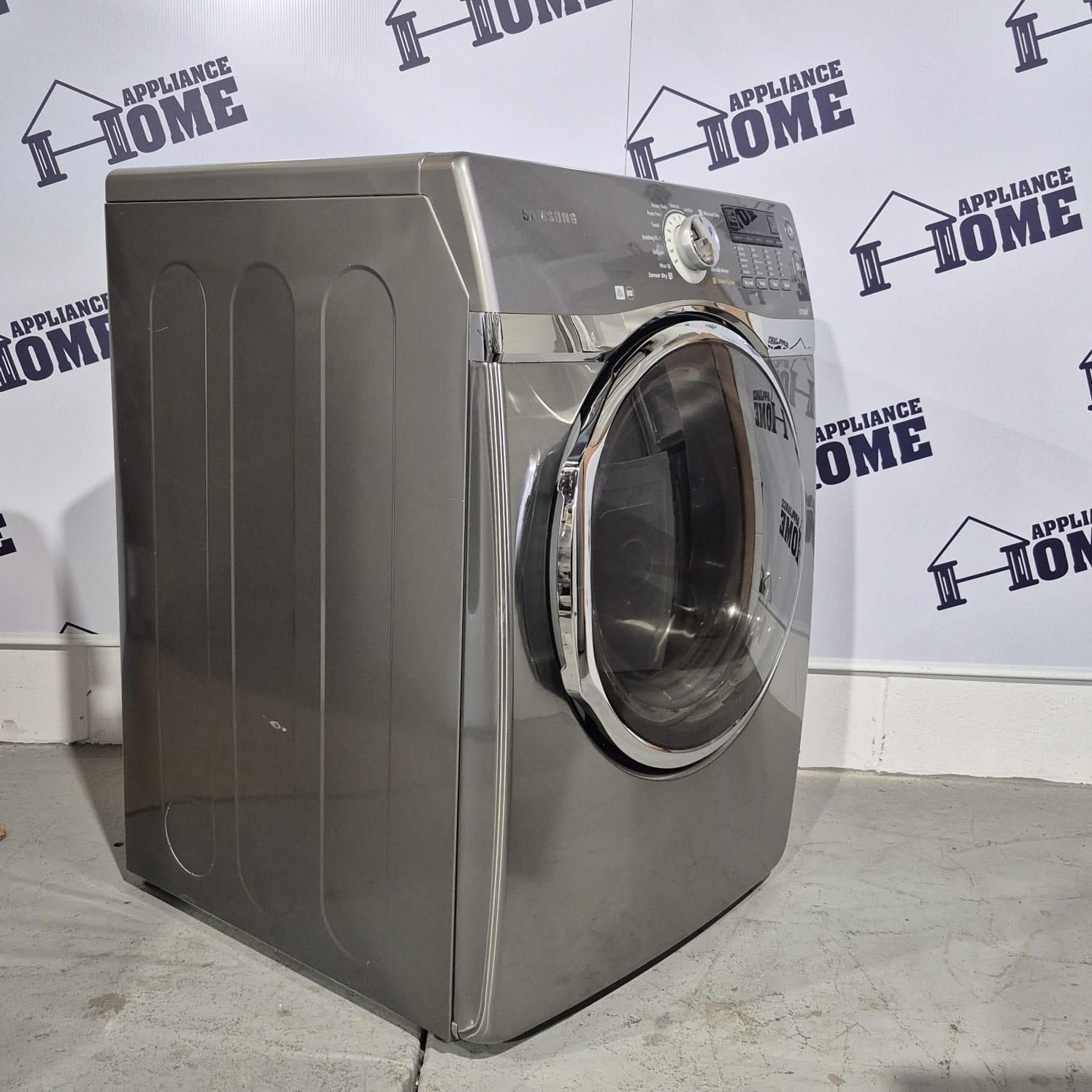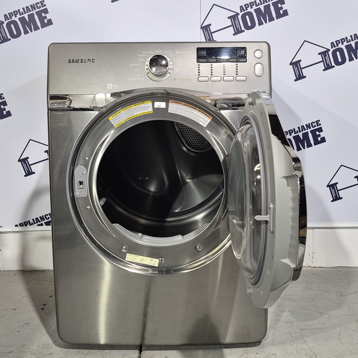 Professionally refurbished Samsung 27″ front-load dryer with a 7.3 cu. ft. stainless steel drum for large loads and bulky items. Features Steam Refresh technology to reduce wrinkles and odors, plus 9 drying cycles and 4 temperature settings for versatile fabric care. Stackable, space-saving design with a sleek stainless steel finish completes your modern laundry setup.