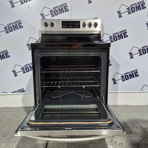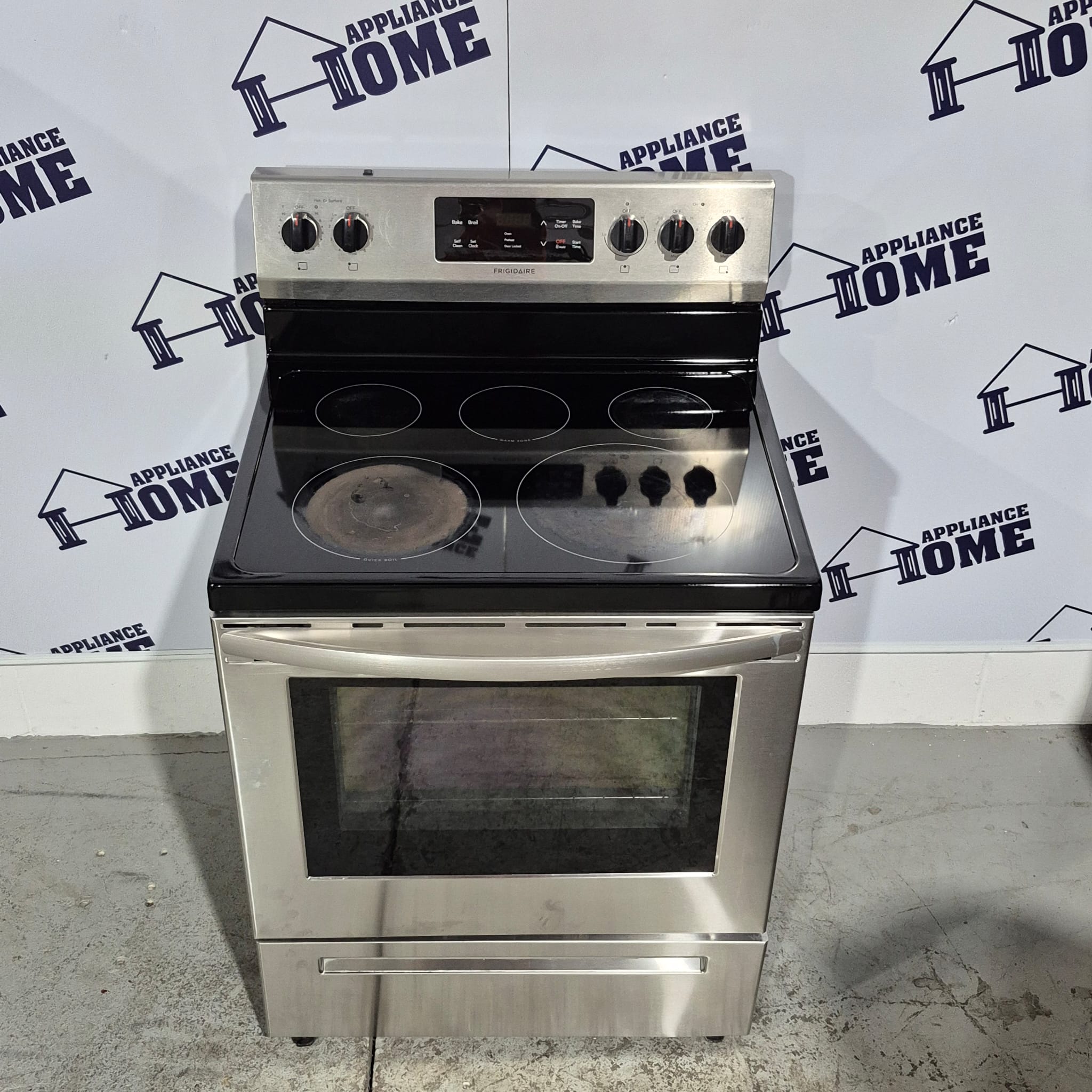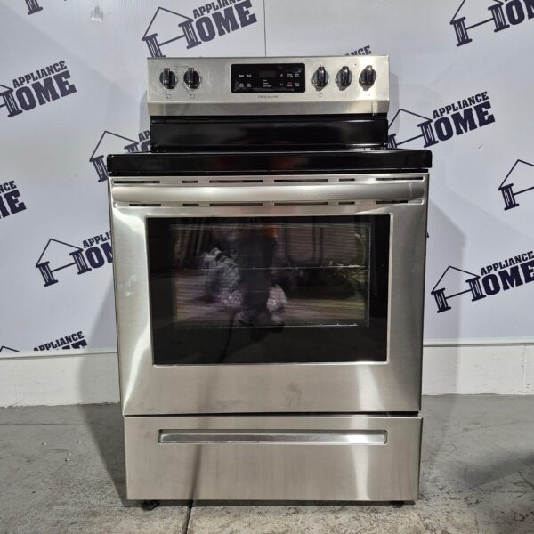 Frigidaire Stove CFEF3054US 30″ Electric, Freestanding, Glass top, 5 burners,  Self Clean, 5.3 cu. ft.  Storage Drawer, Stainless Steel color, Used Refurbished.