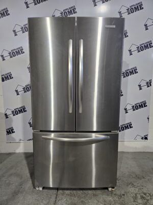 This used GE French door refrigerator has been meticulously inspected, tested, and refurbished to reliable, like-new performance. Any cosmetic wear is minor and does not affect its functionality. It’s an outstanding value for those seeking a full-featured, family-sized refrigerator with the convenience of through-the-door dispensing.