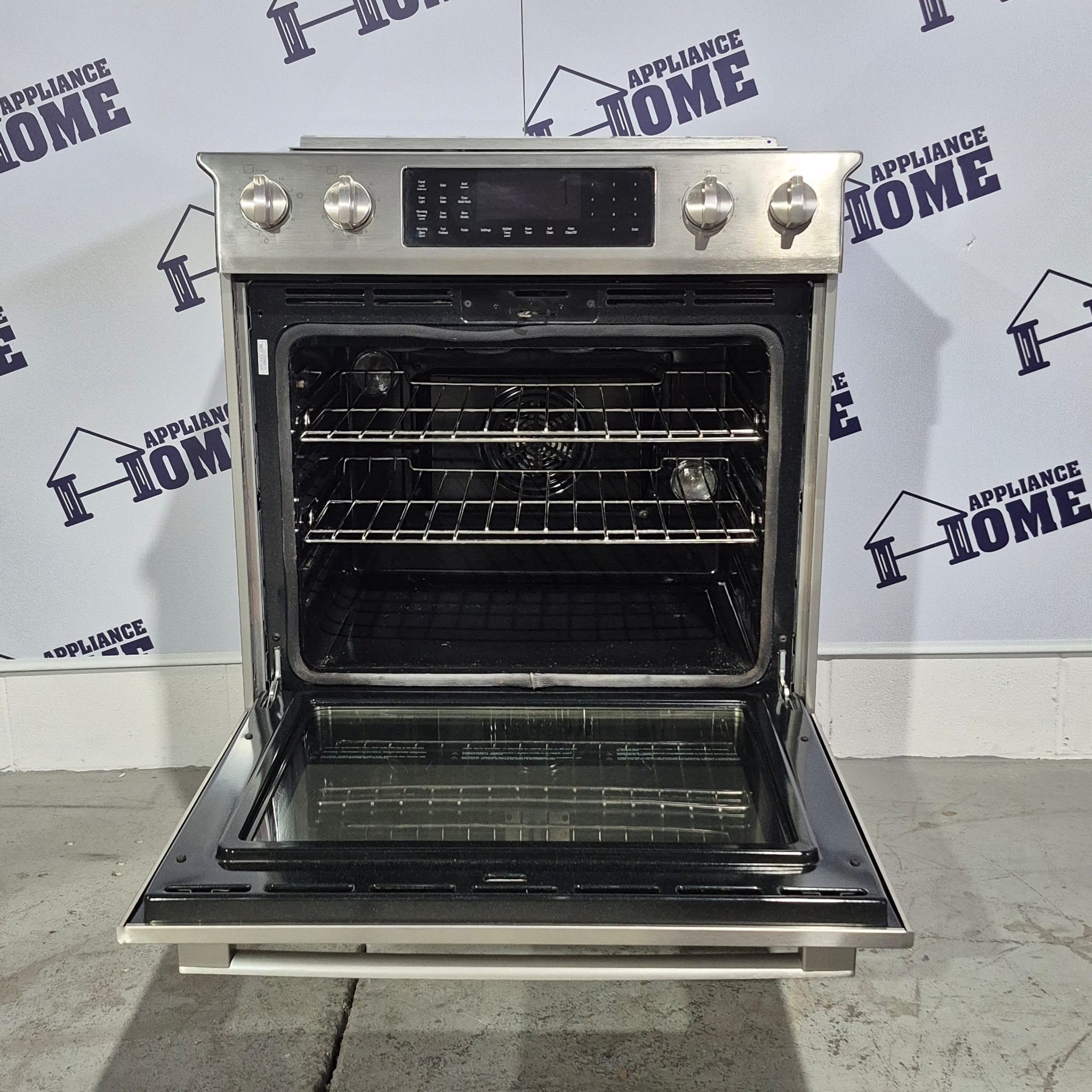 | Features | White LED Stainless Knobs, warmer drawer, keep warm glass top, self clean, built-in. |