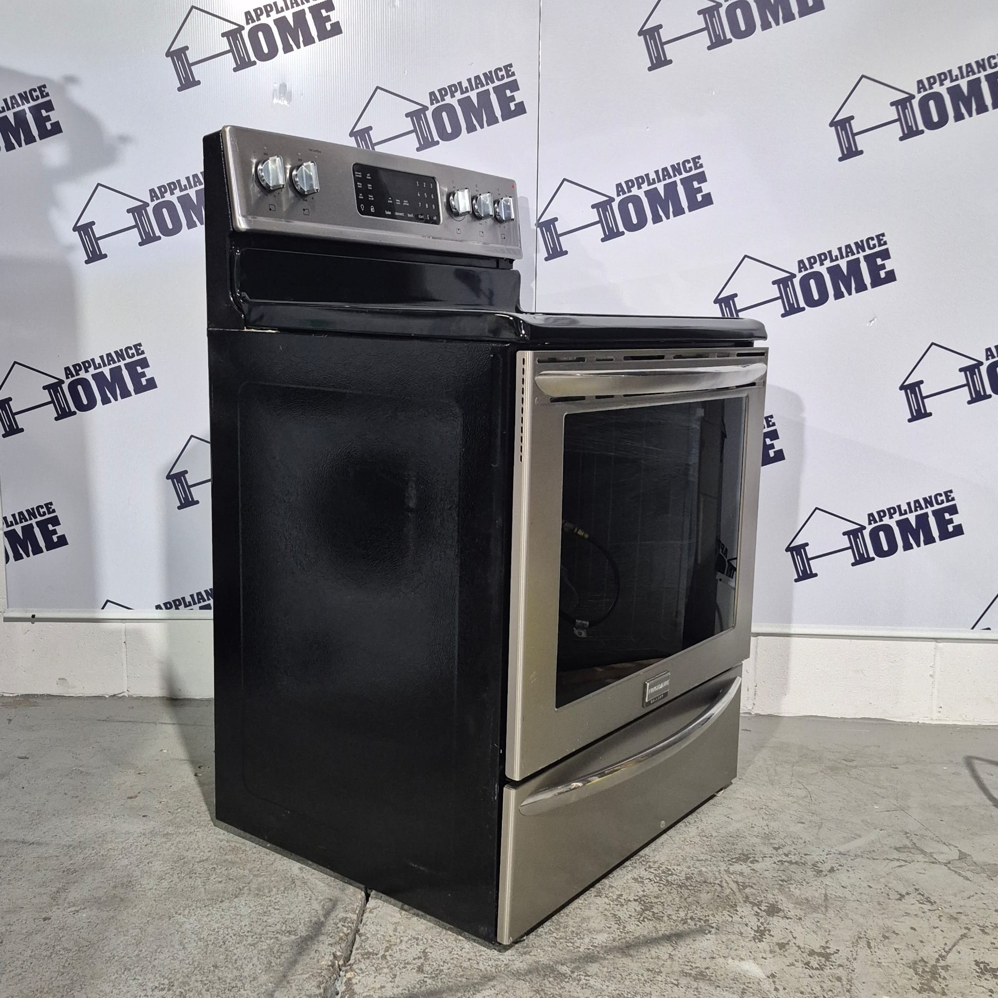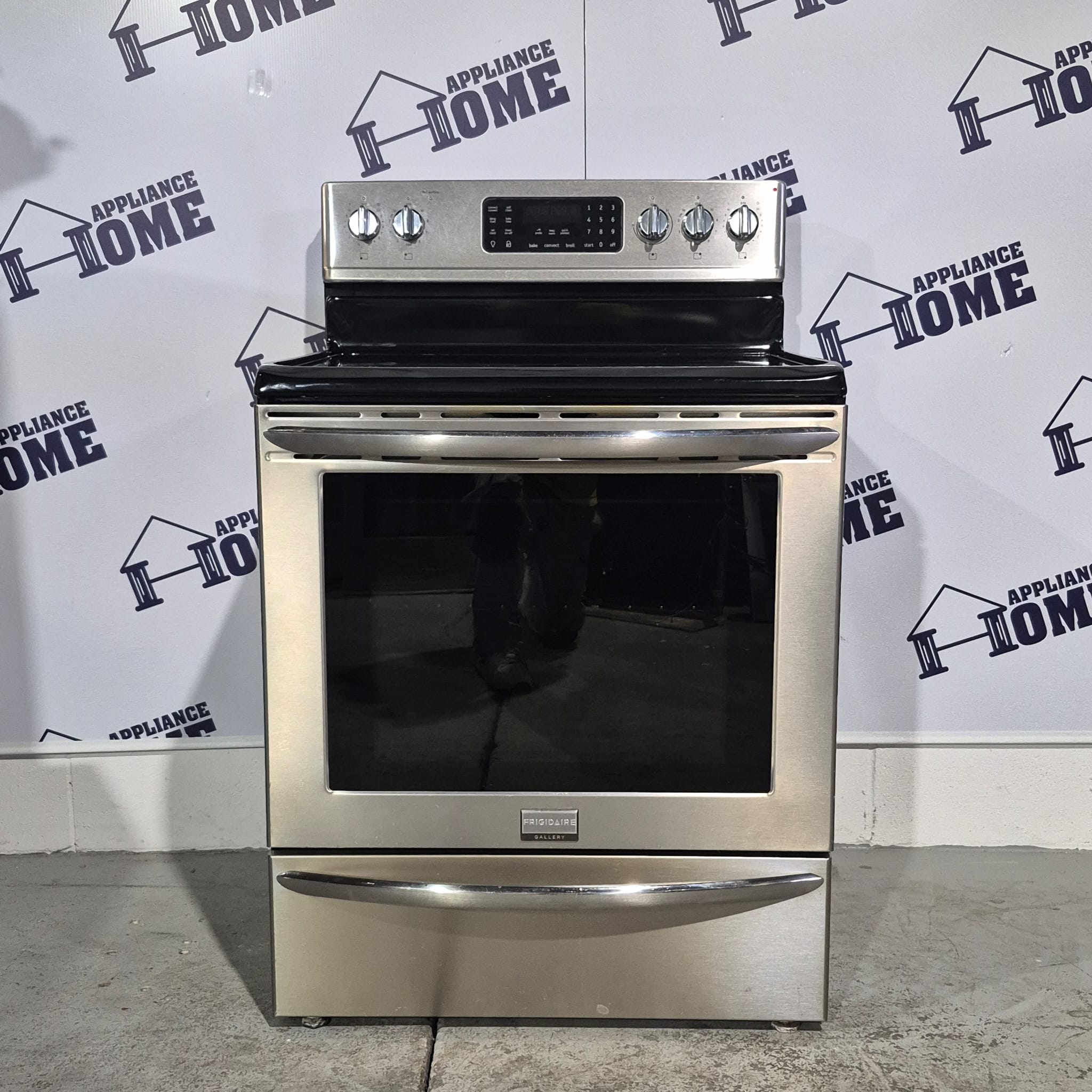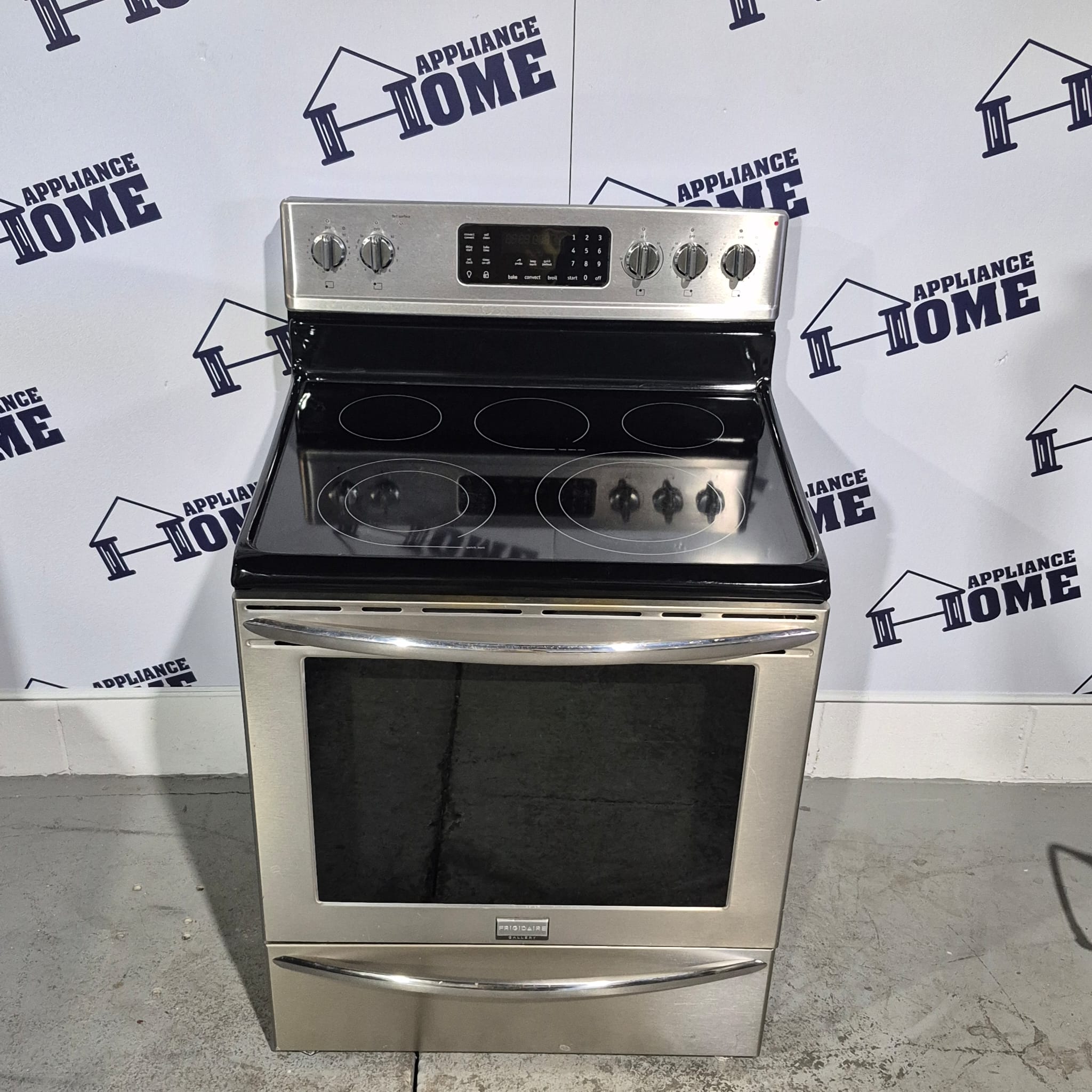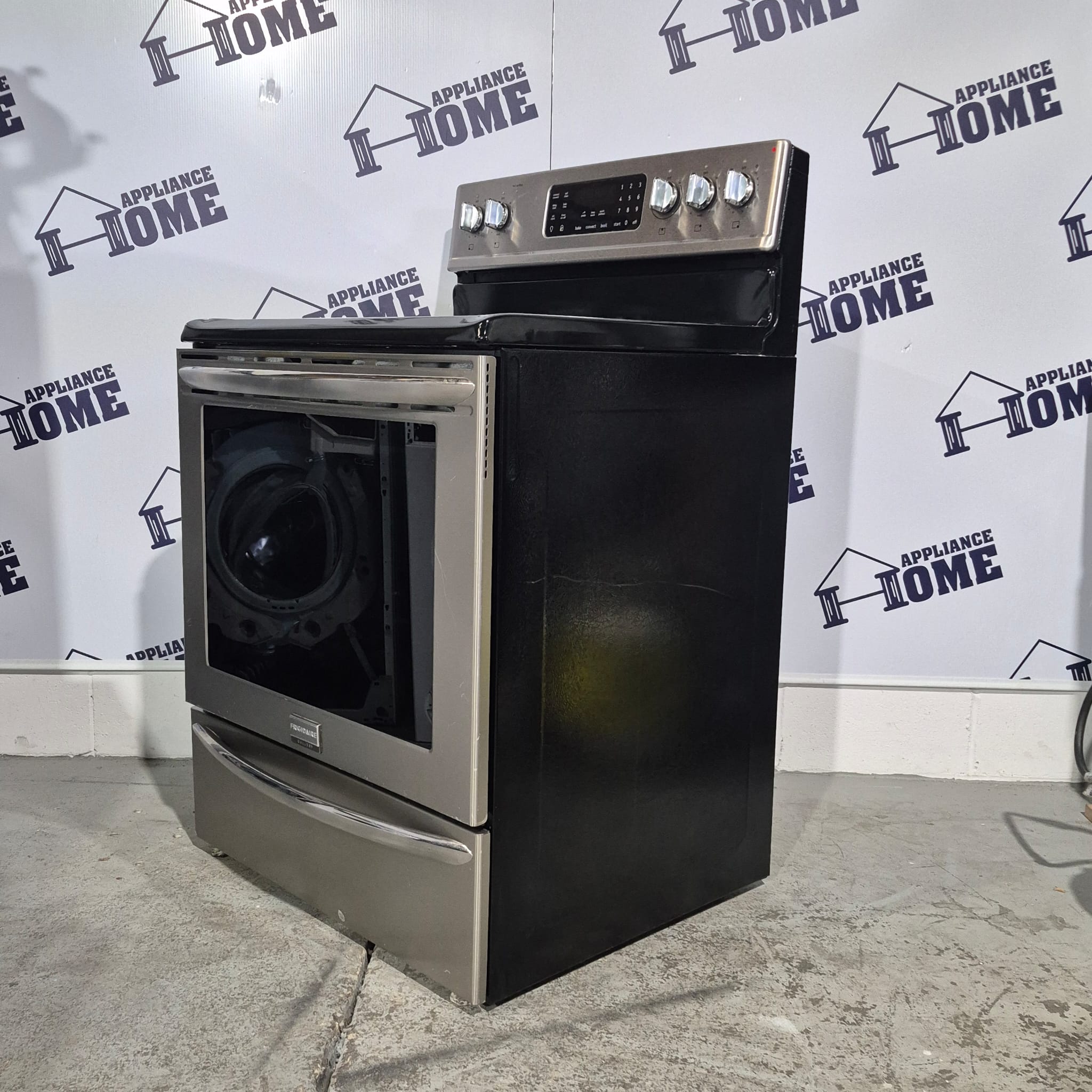 Frigidaire Stove Gallery CGEF3055MFF 30″ Electric, Glass top, 5 burners,  convection, Self Clean, 5.7 cu. ft.  Storage Drawer, Stainless Steel color, Used Refurbished