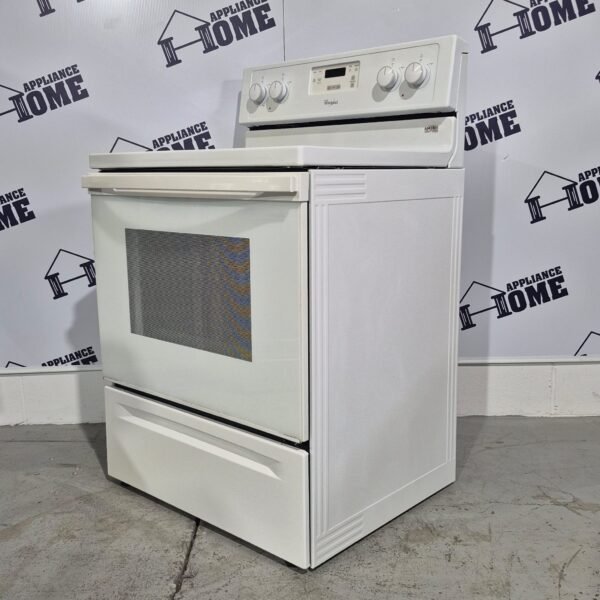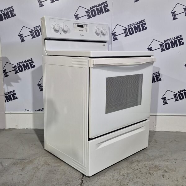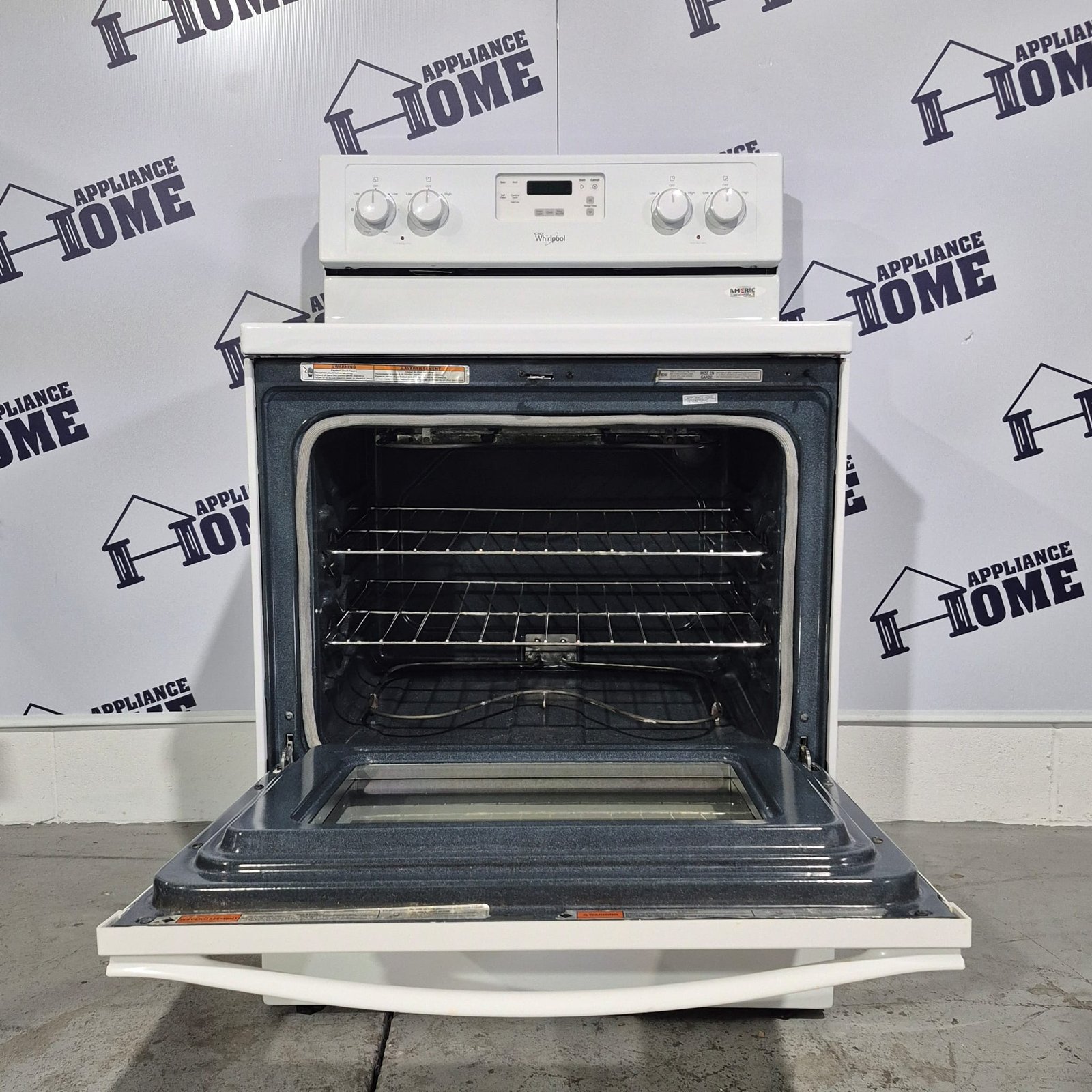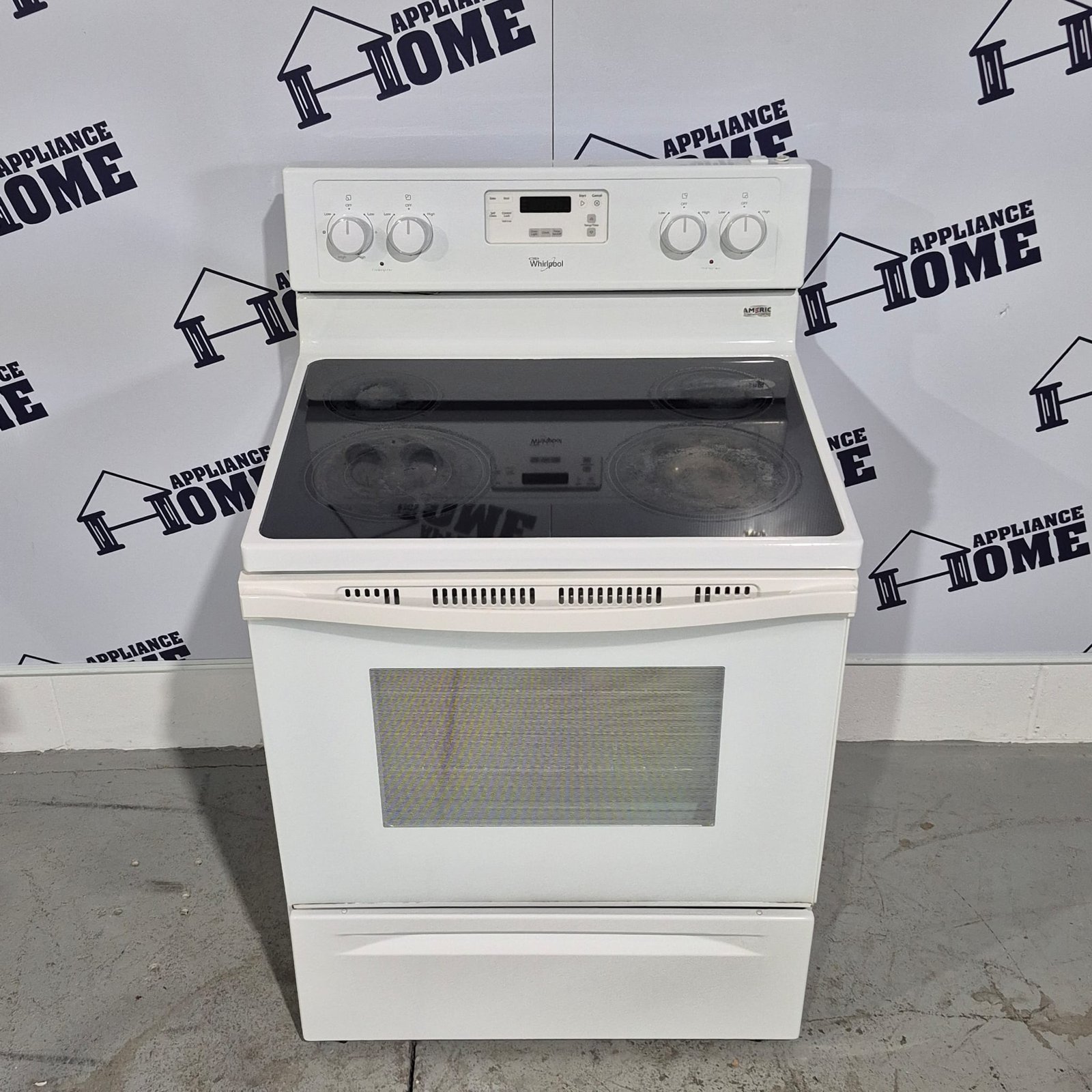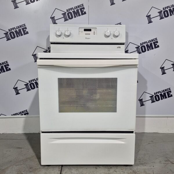 Whirlpool Stove YWFE510S0AW 30″ Electric, Freestanding, Glass top, 5 Burners, self clean, 4.8 cu. ft. Storage Drawer, White color, Used Refurbished.