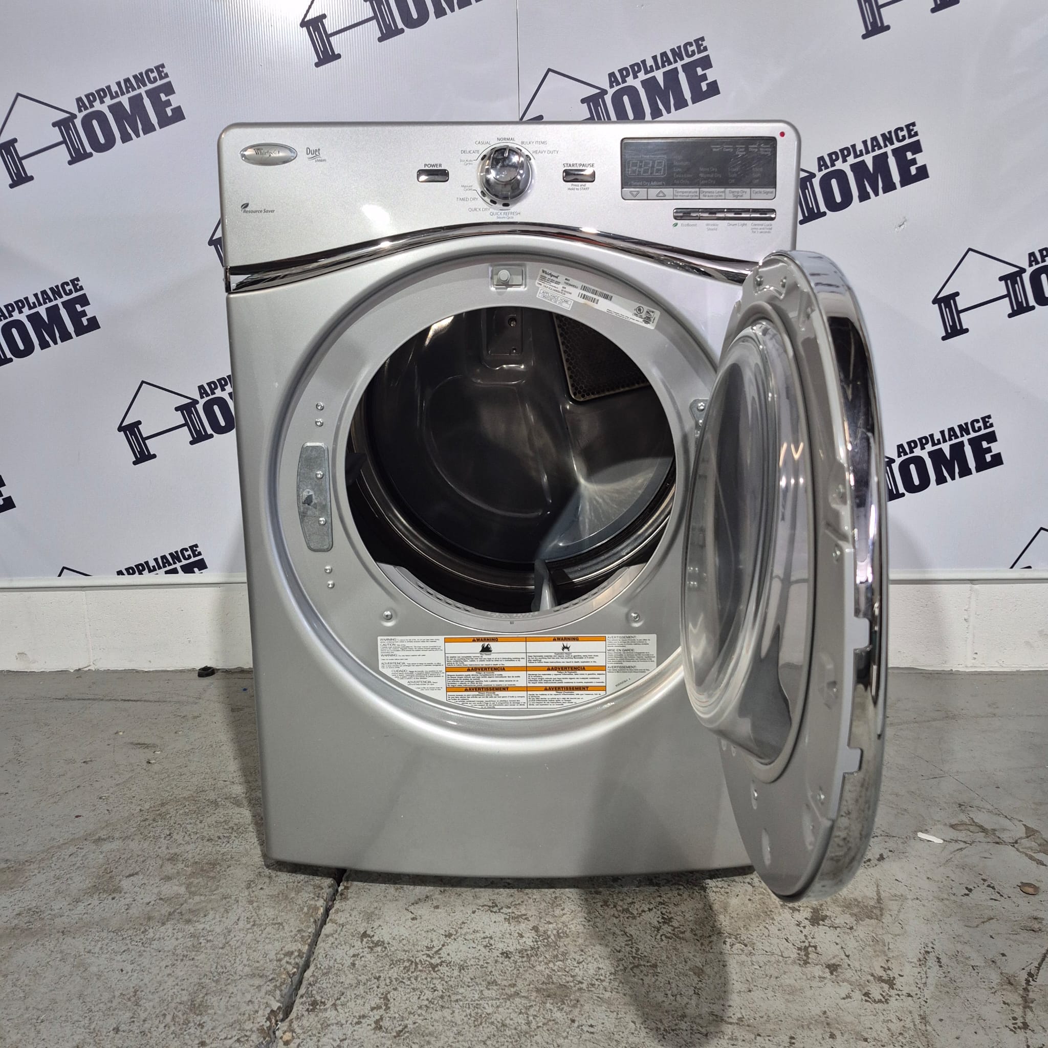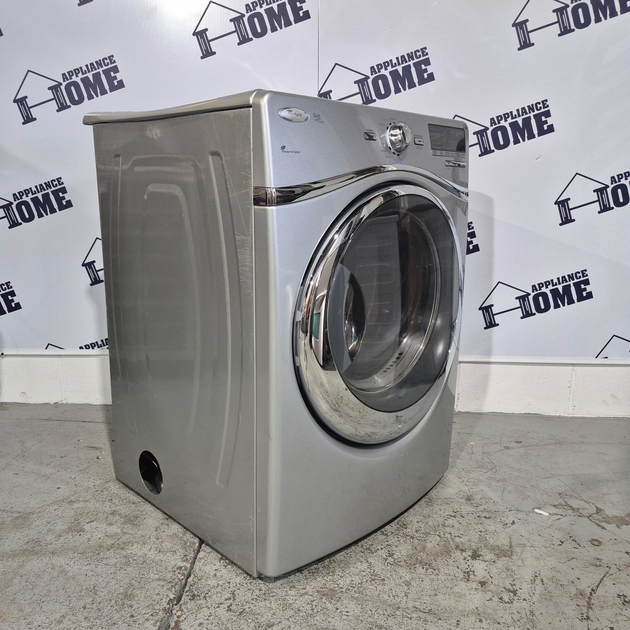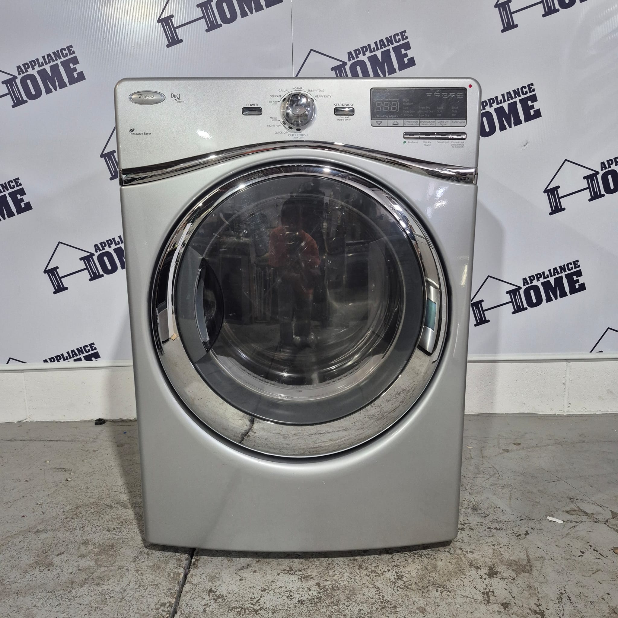 rofessionally refurbished Whirlpool 27″ front-load dryer with a 7.4 cu. ft. stainless steel drum for large loads and bulky items. Features Steam Refresh technology to reduce wrinkles and odors, plus 8 cycles and 4 temperature settings for versatile fabric care. Stackable, space-saving design in a classic white finish fits seamlessly in any laundry room.