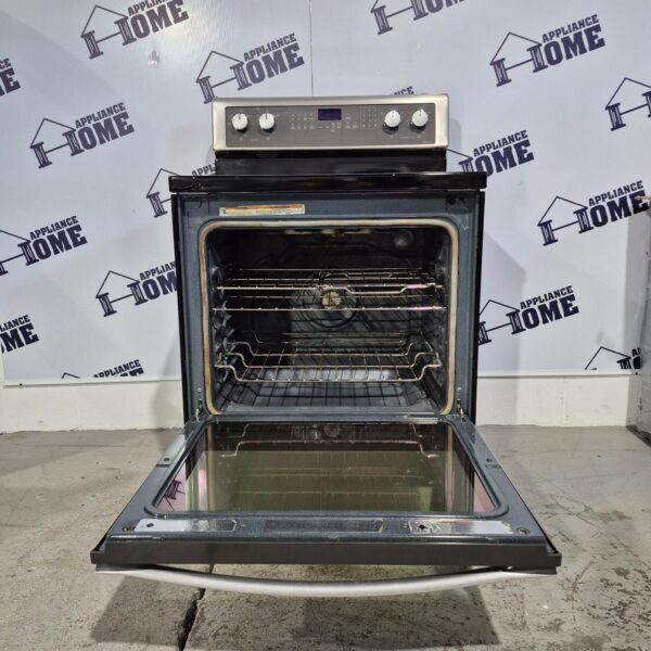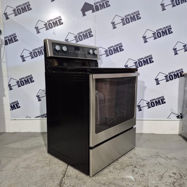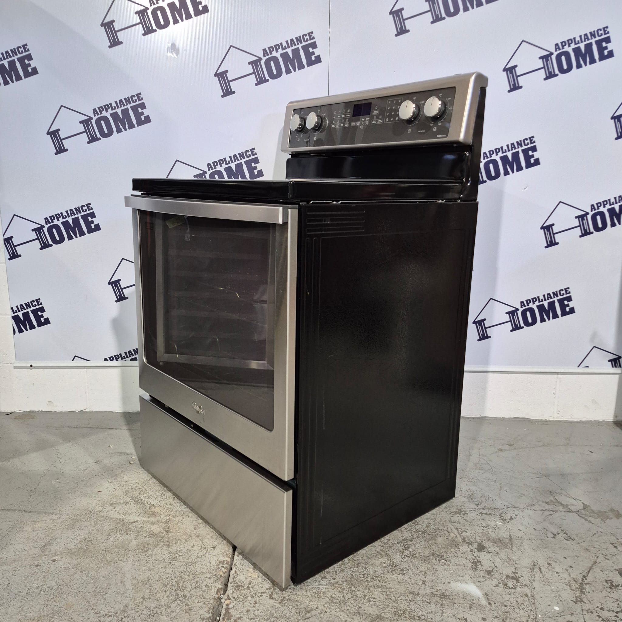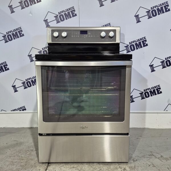 Whirlpool stove YWFE710H0AW 30″ electric, freestanding, glass top, 5 burners, Convection, self clean, large oven, 6.2 Cu Ft, Preheat, storage drawer, white, Used, Refurbished.
